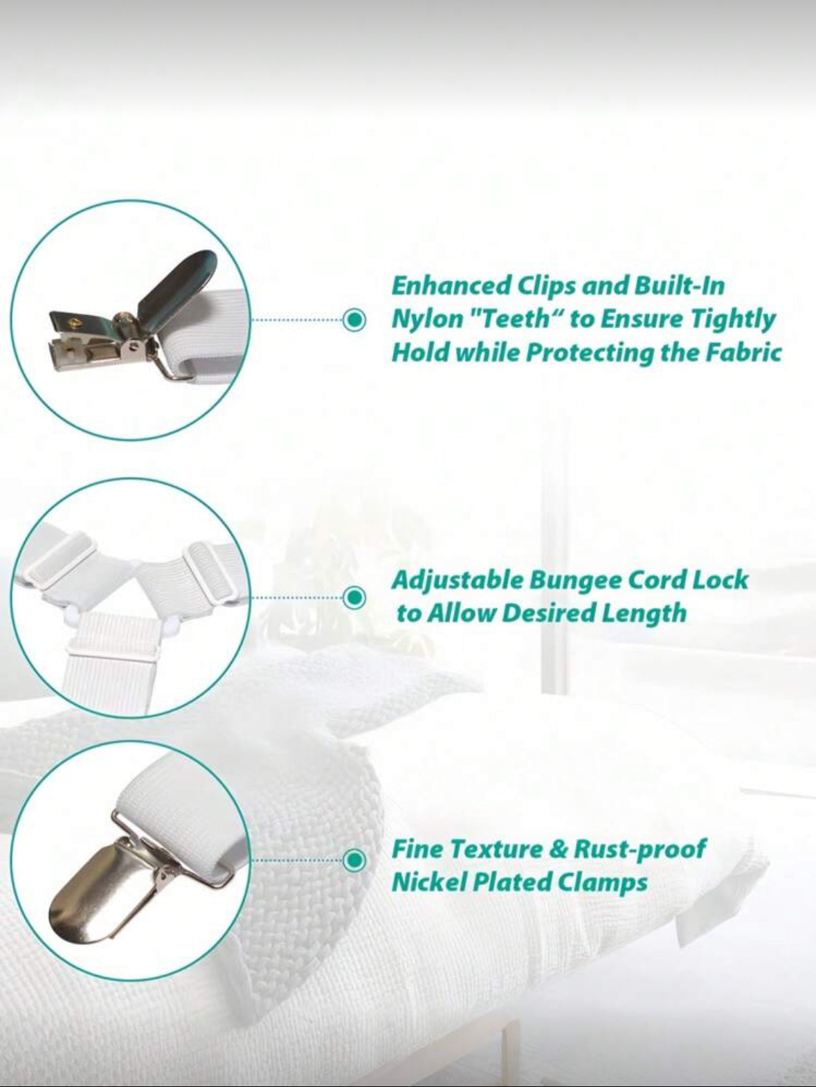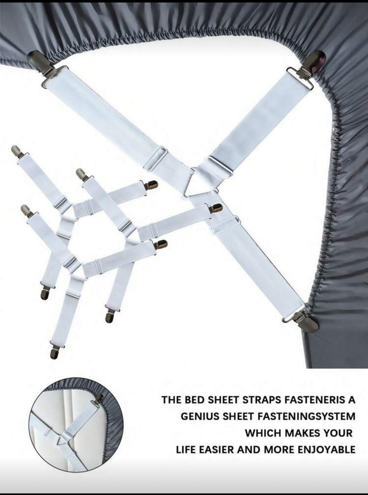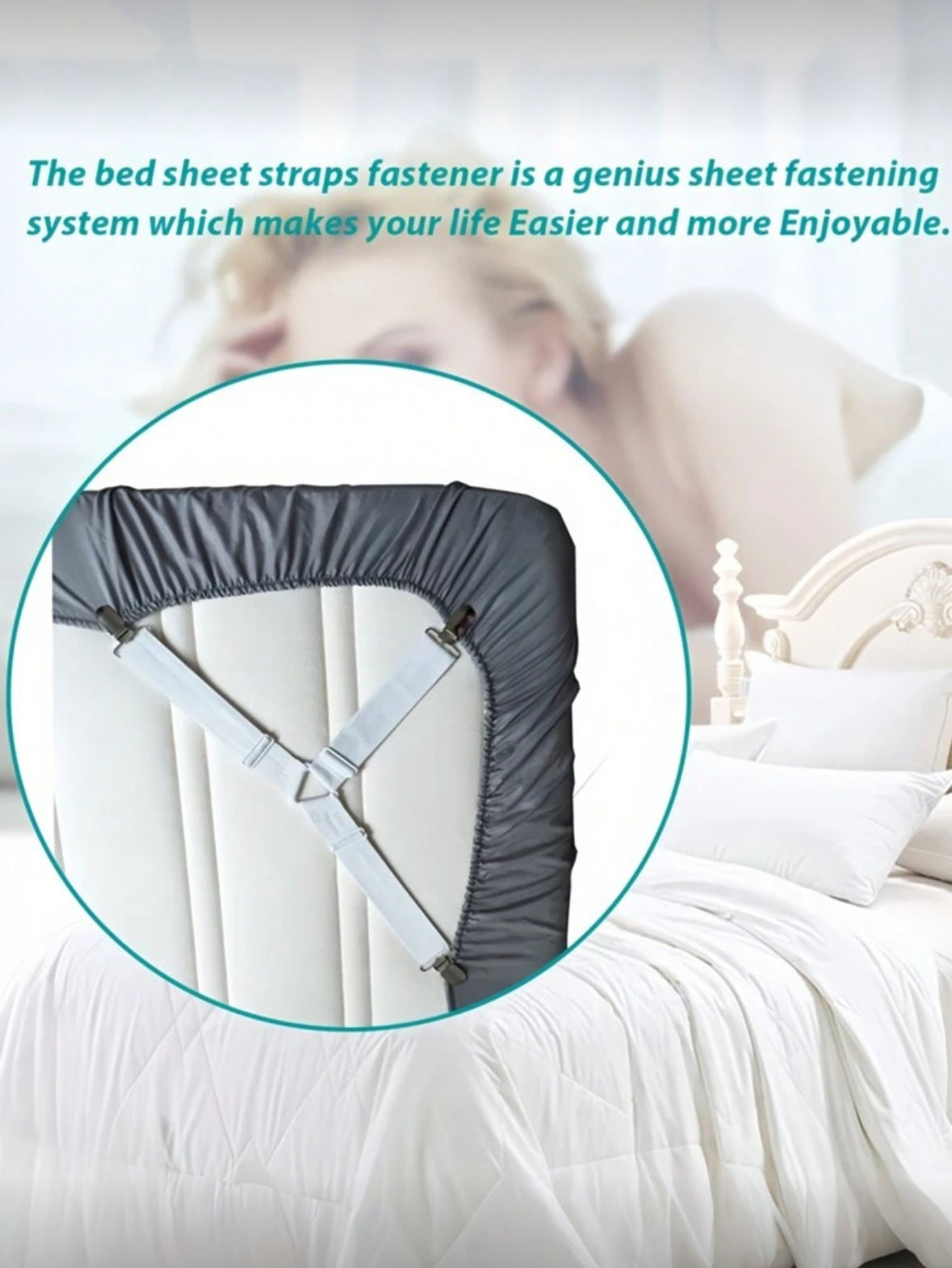 - The set typically includes four triangle-shaped belts designed to secure each corner of a fitted sheet.