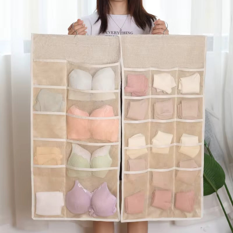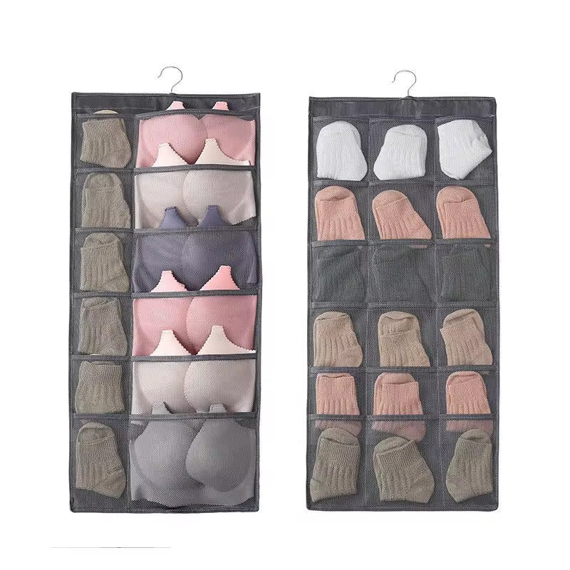 This is a double-sided hanging closet organizer with multiple mesh pockets for storing items like socks, underwear, and other accessories