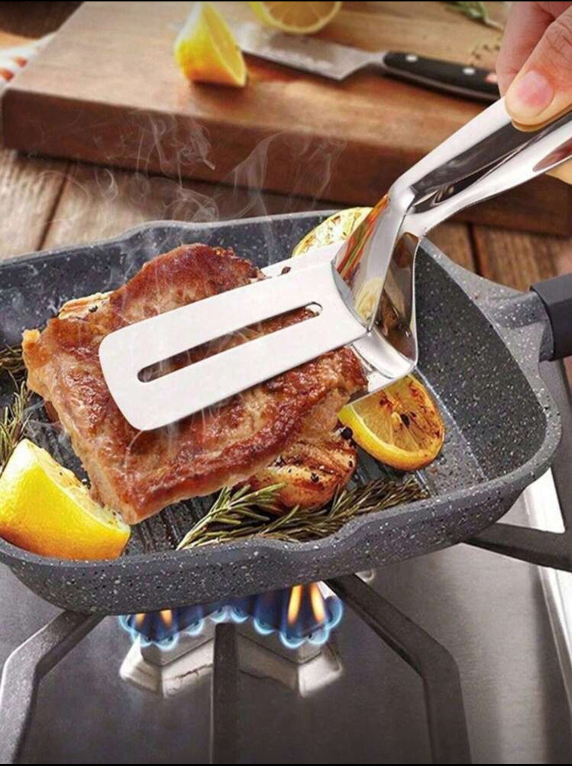 - The design allows for easy flipping and grasping of various foods like steak, fish, and pancakes.