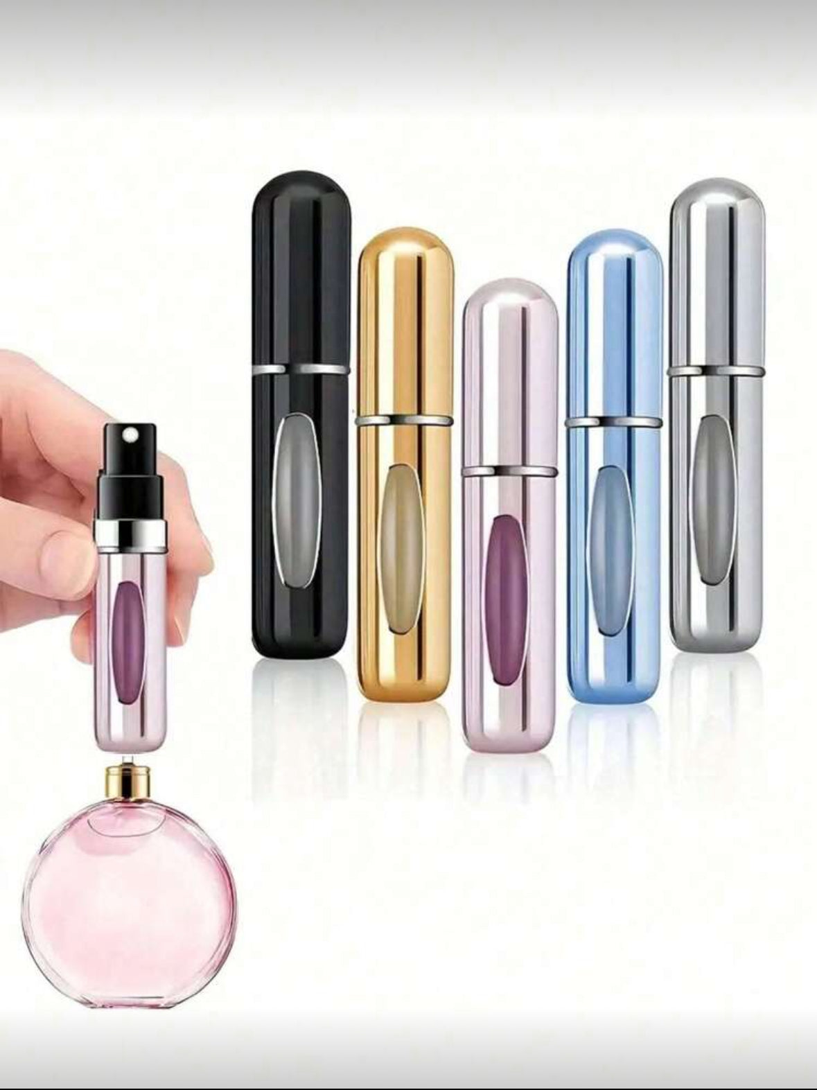 5 pcs mini refillable perfume atomizer bottles, which are designed for convenient, travel-friendly scent storage. These atomizers are typically smaller than a lipstick and allow you to carry your favorite fragrances without bringing a full-sized bottle.