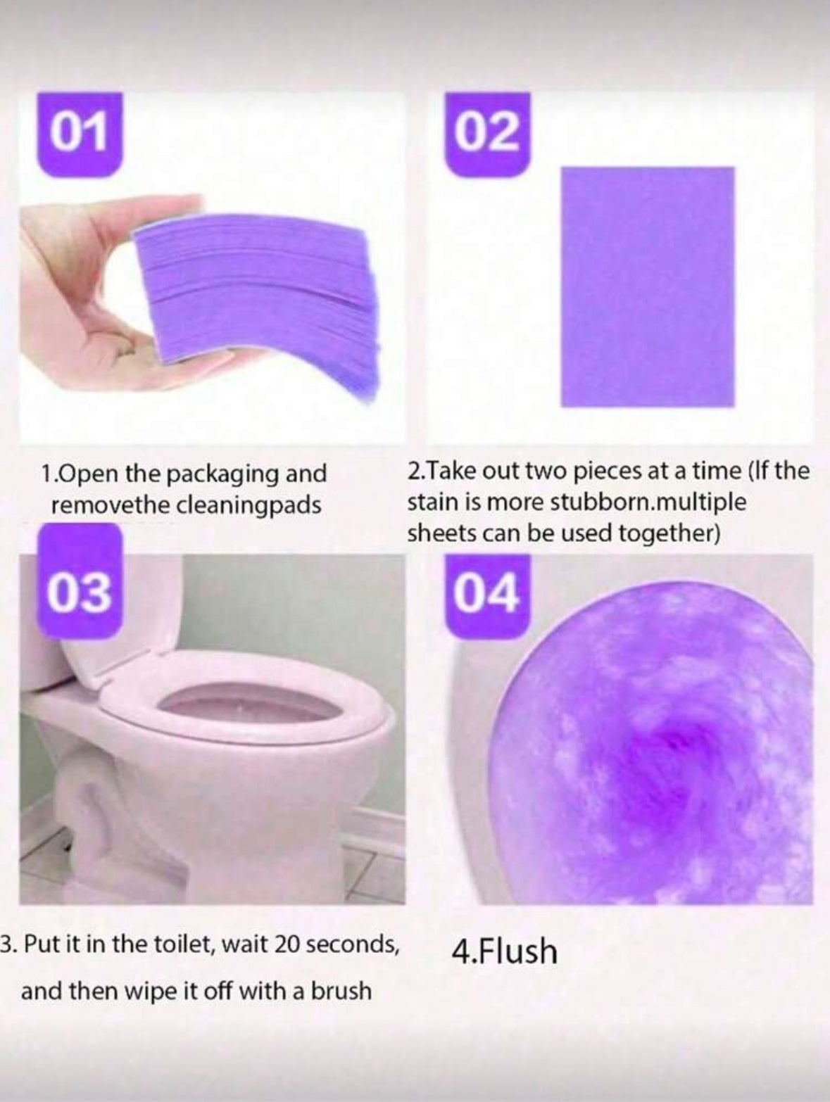 - Tablet Usage: Mix one tablet per 3 liters of water. Simply drop a sheet into the toilet bowl, brush, and flush.